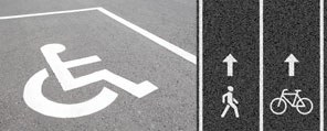 StationnementCentre commerciauxPiste cyclablesTraçage de jeu (école et CPE)Panneaux de signalisationBilles de verre réfléchissantesTraverse de piétonsDéfense de stationnerNumérotation d'espace de stationnementEspace réservé aux handicapés